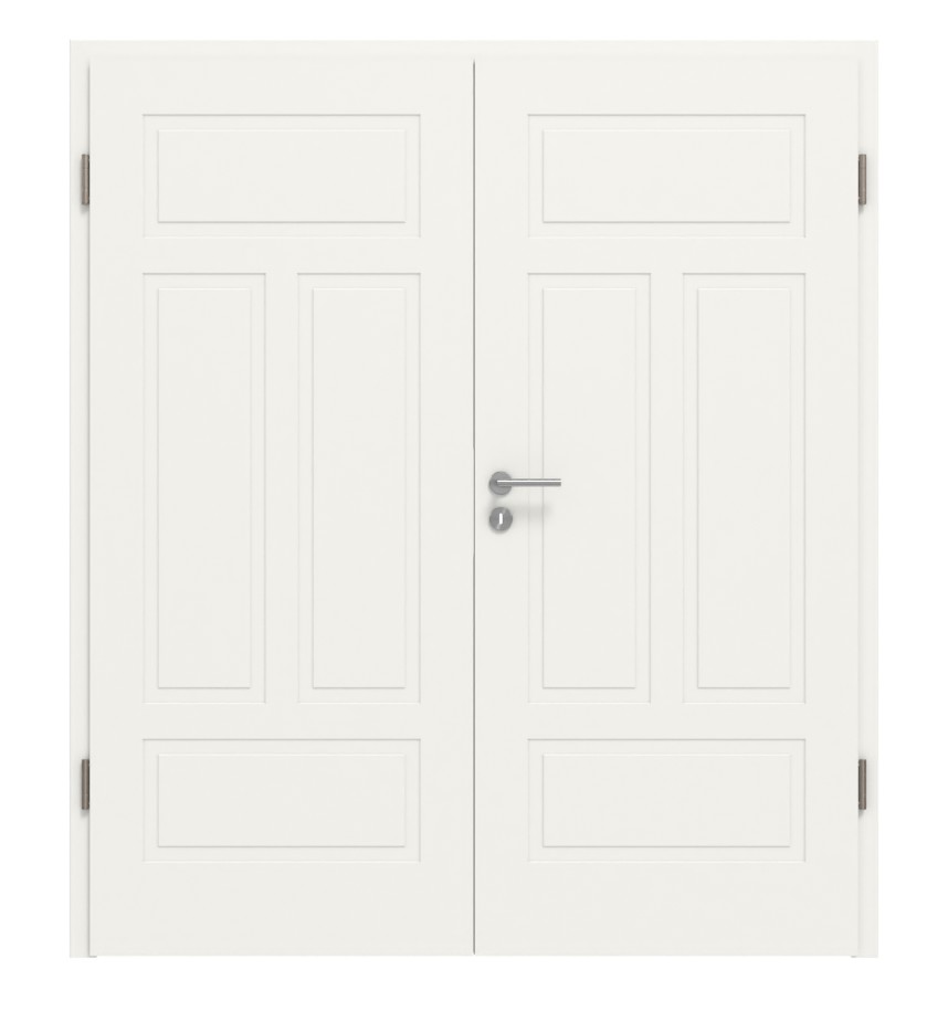 Użyta biel lakieru w RAL 9010 lub RAL 9016 charakteryzuje się ponadczasowym pięknem. Dzięki połączeniu kwadratowych krawędzi skrzydeł drzwiowych i wbudowanej ramy powstaje zarówno klasyczny element, jak i nowoczesny akcent. Z piękną optyką kasetową te drzwi podwójne przyciągają podziwiające spojrzenia.