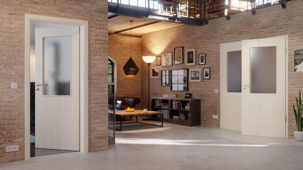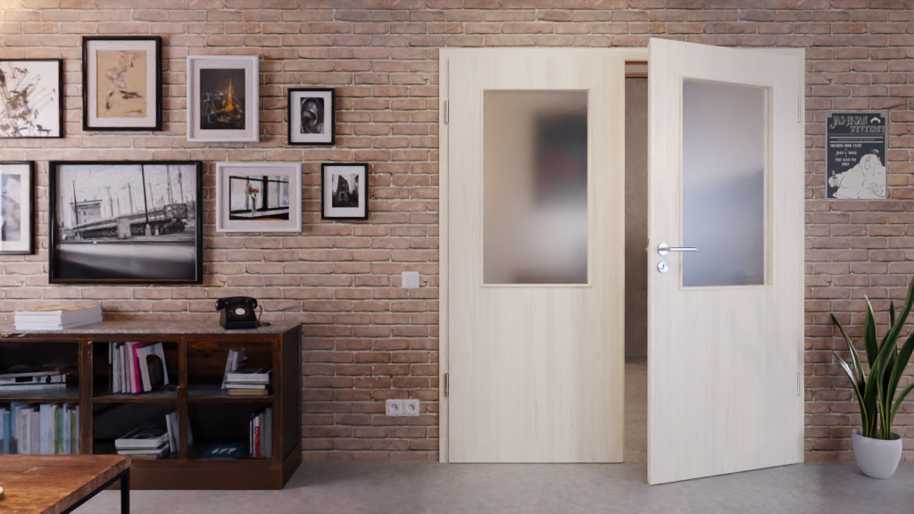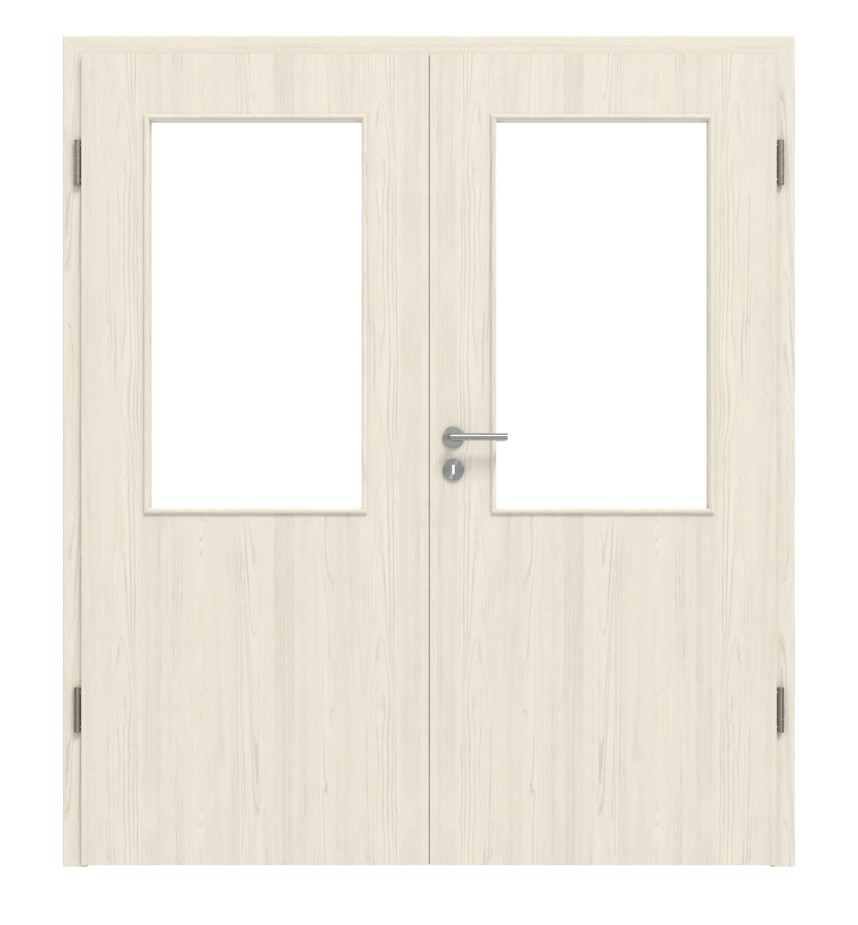 Zapraszające, podwójne drzwi wewnętrzne z rdzeniem z pełnych płyt wiórowych i odporną na światło powierzchnią Durat w kolorze lazurowym: