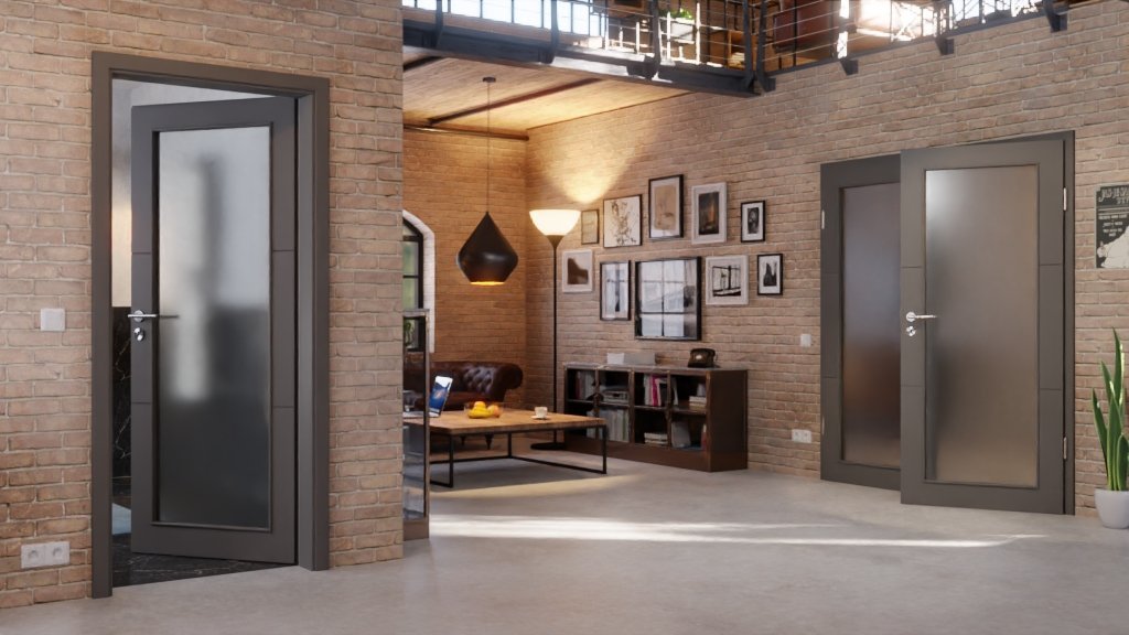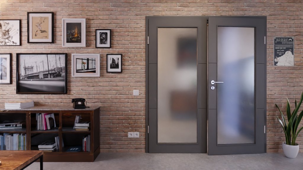 Estetyczne drzwi podwójne z przeszkleniami i wkładką z pełnej płyty: