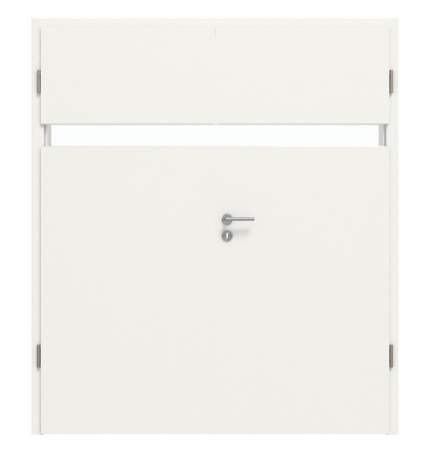 Malowane w białym RAL 9016 lub czystym białym RAL 9010 skrzydła drzwi fascynują swoim ponadczasowym pięknem. Poziomy i wąski przeszklenie rozciąga się na całej powierzchni obu skrzydeł, nadając temu modelowi wyjątkowy charakter. Wybierz według osobistych preferencji między okrągłymi a prostokątnymi krawędziami skrzydeł drzwi.