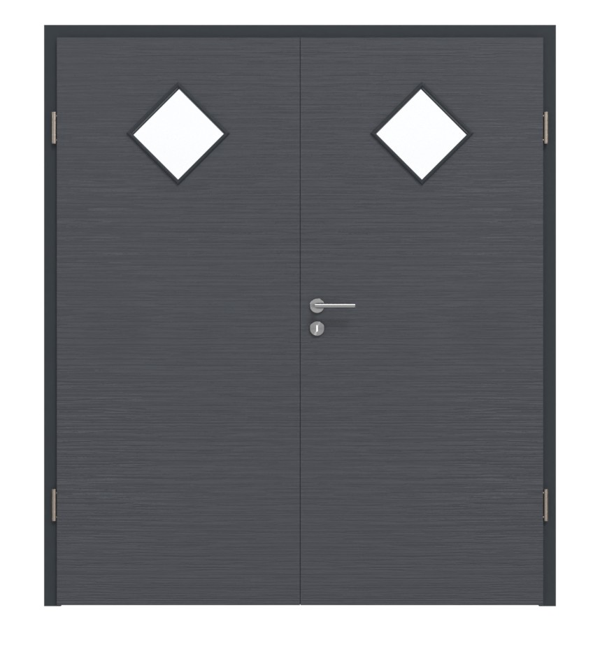 W górnej części skrzydeł drzwi znajduje się wyrazisty przeszklenie w kształcie kwadratu stojącego na wierzchołku. Piękne wzornictwo kończy się na głęboko wytłaczanej powierzchni Versio-Durat w kolorze antracytowym, która dzięki wyczuwalnej strukturze łupka zapewnia unikalny wygląd i dotyk. Dodatkowo powłoka ta jest odporna na uderzenia i ścieranie oraz łatwa w pielęgnacji.