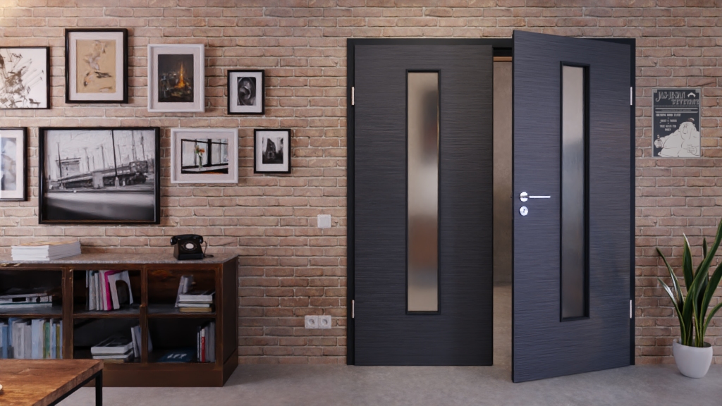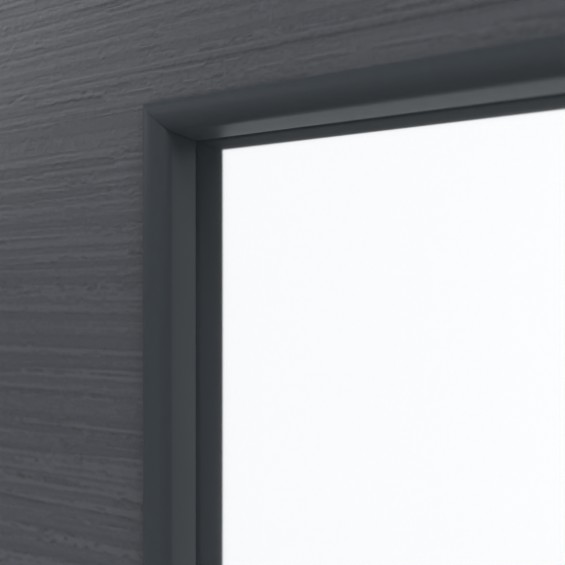 Delikatne listwy szklane otaczają wąskie przeszklenia w środku skrzydeł drzwiowych. Elegancka powierzchnia Versio-Durat w kolorze antracytowym charakteryzuje się głęboko wytłoczoną strukturą łupka. Jej wytrzymała konstrukcja zapewnia wysoką odporność na uderzenia i ścieranie oraz przyjemny komfort pielęgnacji.