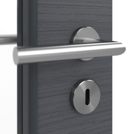Otoczone delikatnymi listwami szklanymi, sześć dużych przeszkleń znacząco wpływa na design drzwi. Piękny design kończy się w głęboko wytłaczanej powierzchni Versio-Durat w kolorze antracytowym, która dzięki wyczuwalnej strukturze łupka zapewnia unikalny wygląd i dotyk. Dodatkowo powłoka jest odporna na uderzenia i ścieranie oraz łatwa w pielęgnacji.