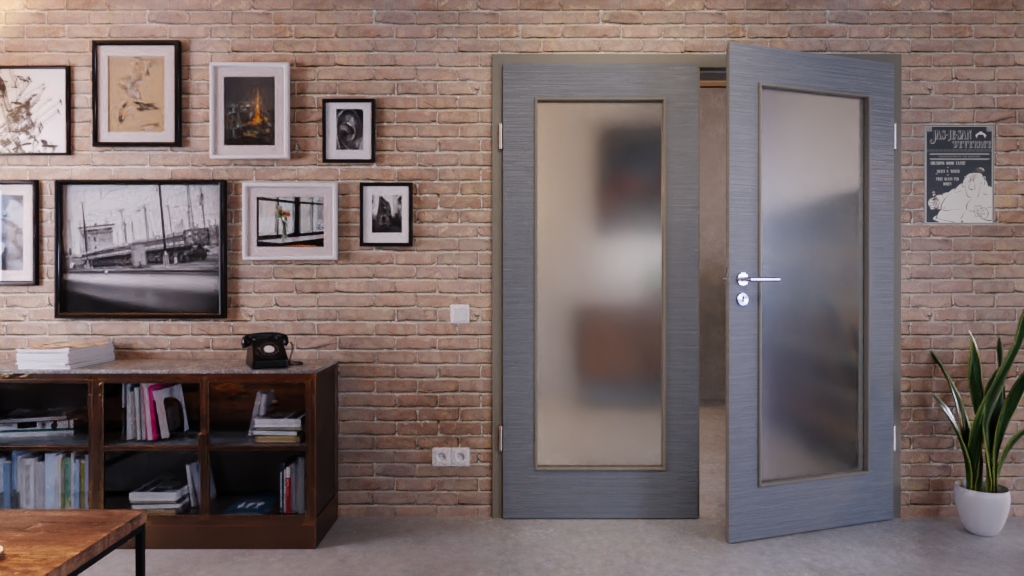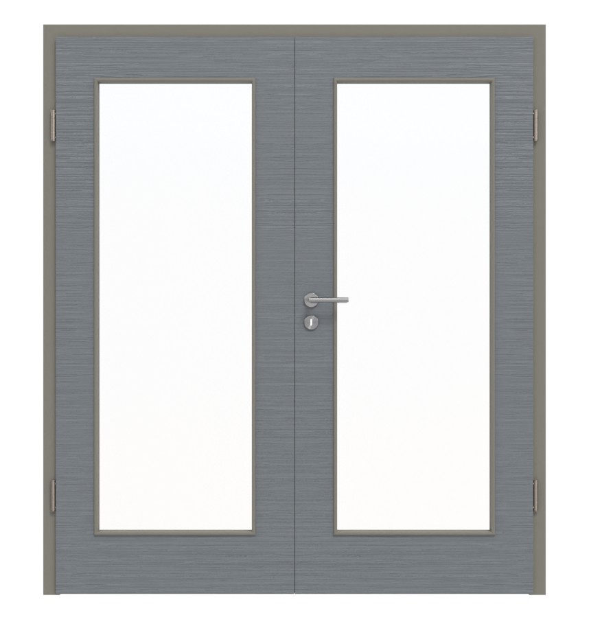 Atrakcyjne drzwi podwójne z rdzeniem z pełnego wióra i wytrzymałą powłoką Durat w strukturalnym odcieniu Hygge szarości: