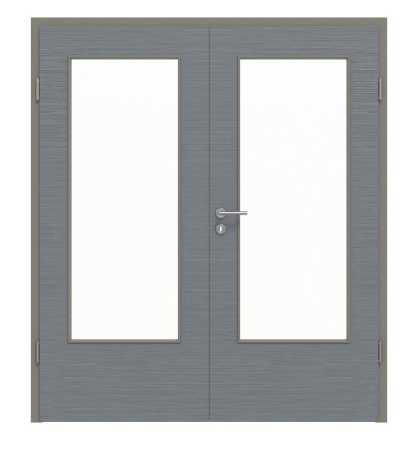 Nowoczesny zestaw drzwi i ościeżnicy: W drzwiach podwójnych Basic Versio Strukturiert Hygge szary marka Huga łączy modny wygląd z doskonałą funkcjonalnością.