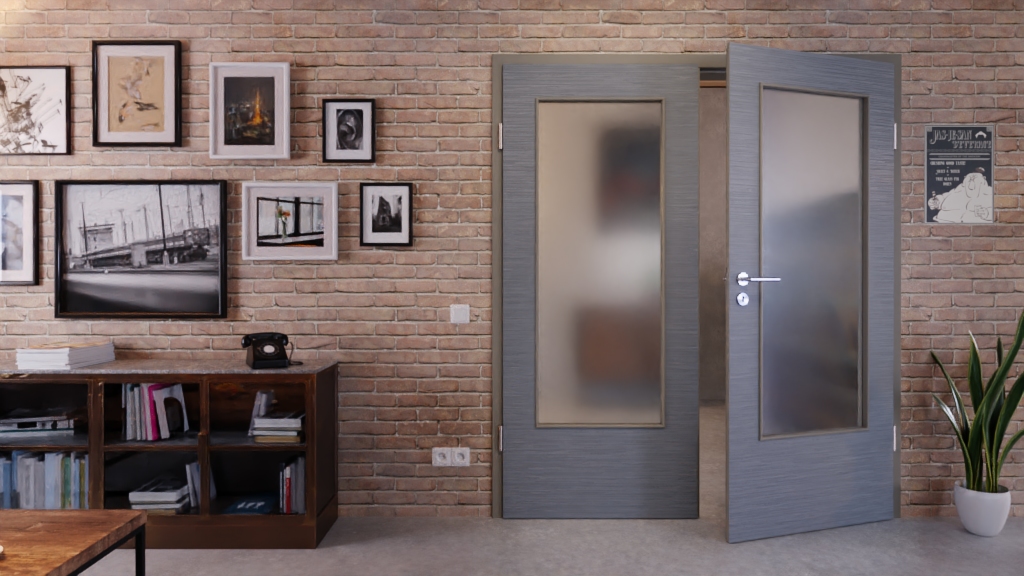 Robustne drzwi skrzydłowe z rdzeniem pełnoobciążeniowym i łatwą w pielęgnacji powłoką Durat w strukturalnym odcieniu Hygge szaro: