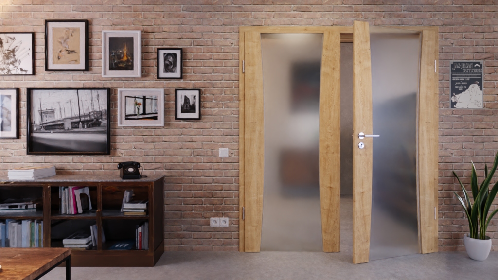 Nowoczesne drzwi podwójne z elementem szklanym i odporną na światło powłoką Durat: