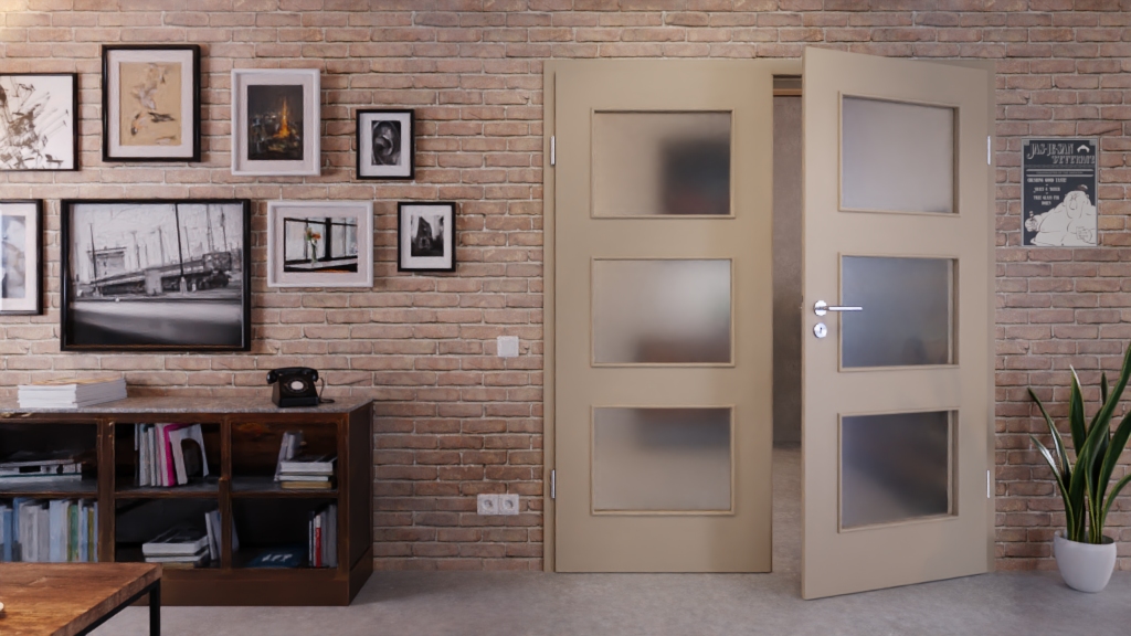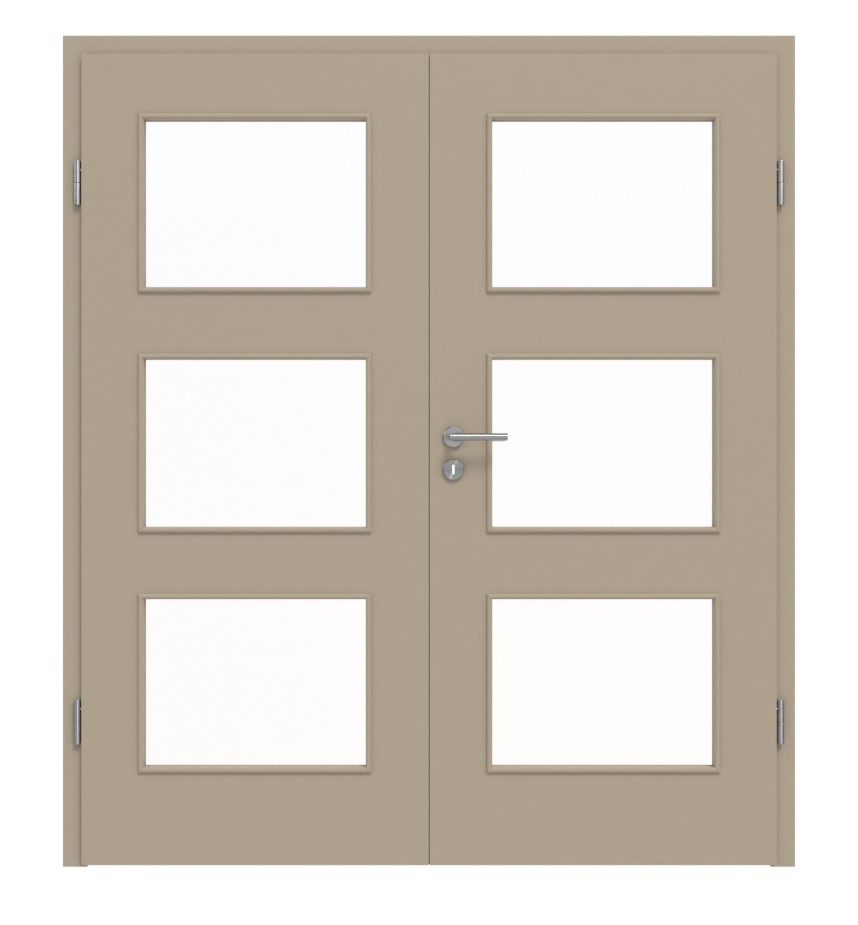 Stylowa podwójna drzwi z pełnymi wzmocnieniami i odporną na ścieranie powłoką Durat w ultramatowym taupe: