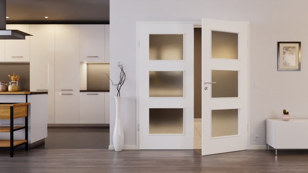 Atrakcyjna podwójna drzwi z pełnym rdzeniem i solidnym wykończeniem Durat w ultramatowej bieli: