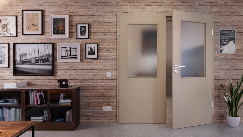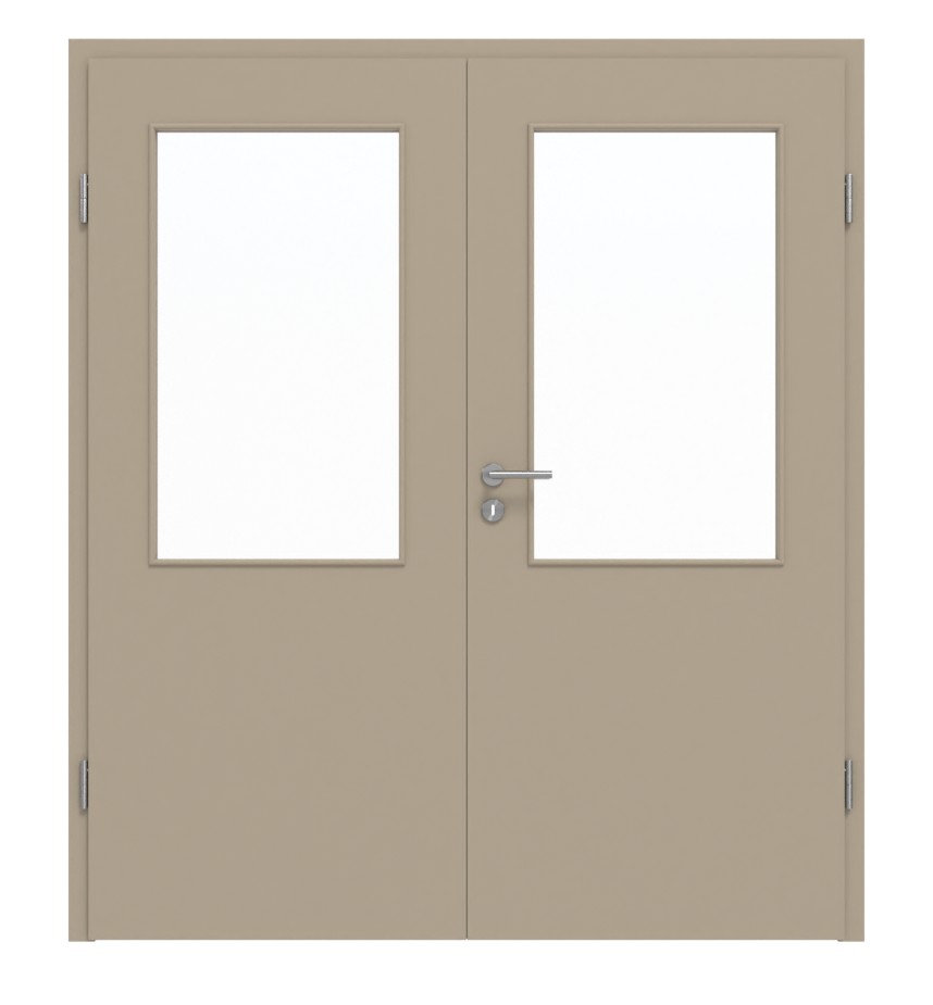 Stylowa drzwi podwójne z pełnymi wzmocnieniami i odporną na światło powłoką Durat w ultramatowym taupe: