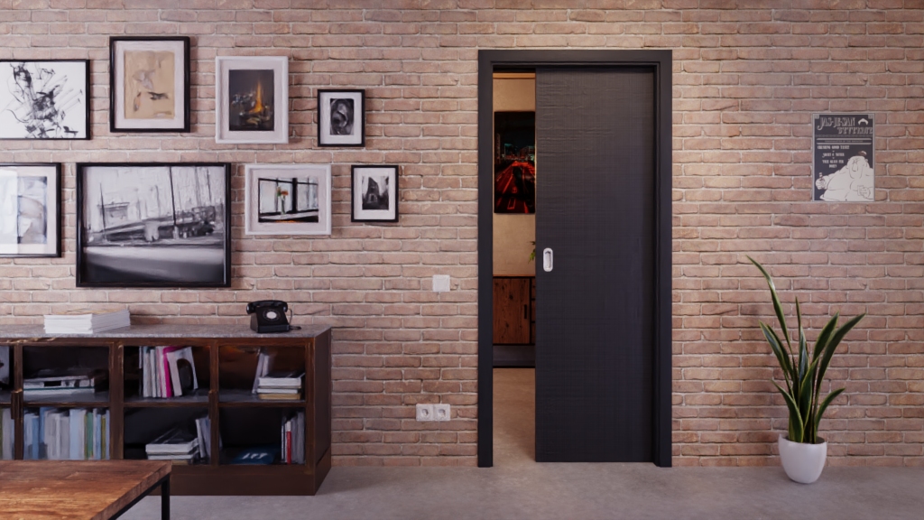 Stylowe drzwi przesuwne w ciemnej teksturze:
