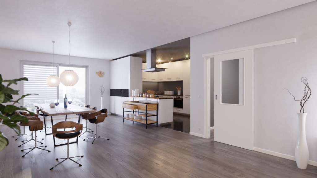 Ponadczasowe drzwi przesuwne z wkładką pełnoobwodową i odporną na światło dekoracją Durat: