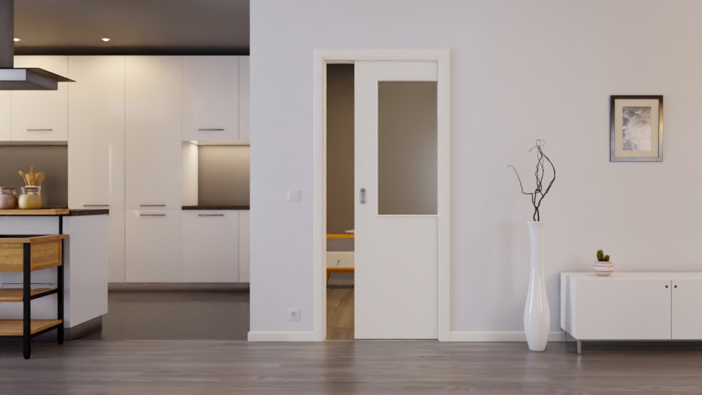 Nowoczesne drzwi przesuwne z rdzeniem pełnoobciążeniowym i gładkim wykończeniem lakieru w białym kolorze podobnym do RAL 9010: