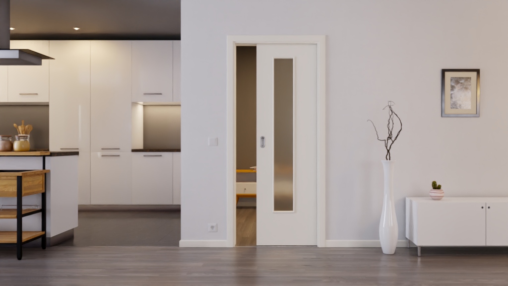 Harmoniczne drzwi przesuwne z rdzeniem pełnoobwodowym i równomierną powierzchnią lakieru w bieli podobnej do RAL 9010: