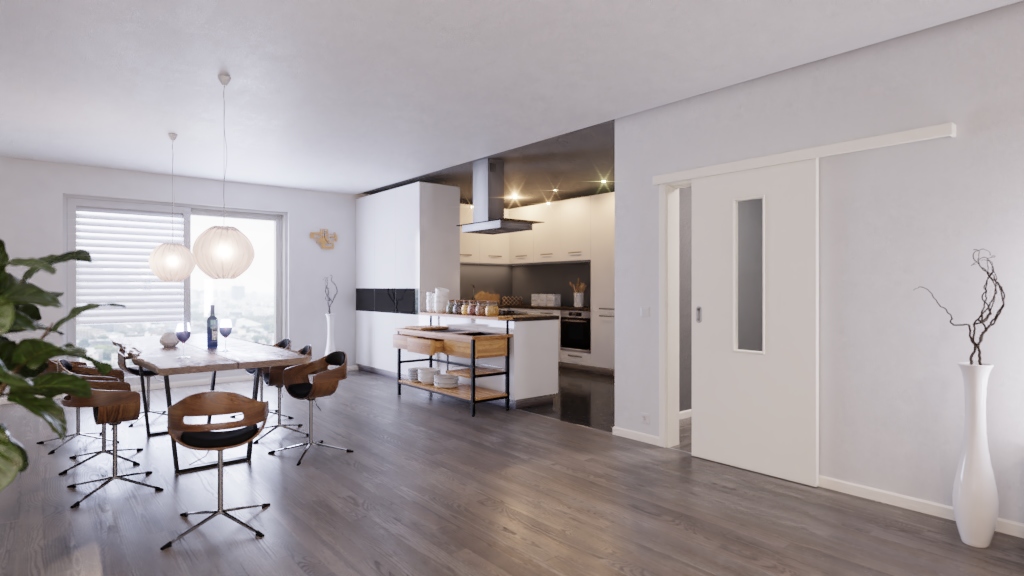 Stylowa drzwi przesuwne z rdzeniem z pełnej płyty i równomiernym wykończeniem lakieru w bieli podobnej do RAL 9010: