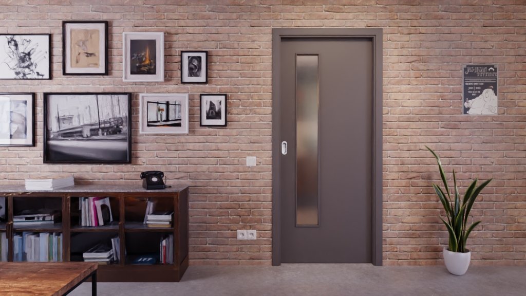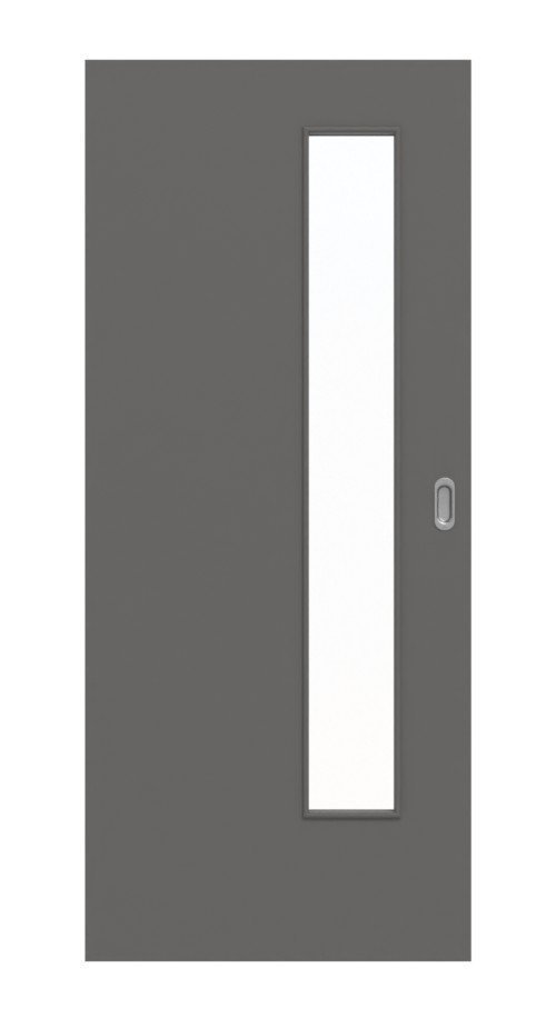 Charakterystycznym elementem nowoczesnego designu jest wąski otwór szklany po stronie zamka skrzydła drzwiowego. Wykończenie stanowi wysokiej jakości lakier w odcieniu Hygge Szary.