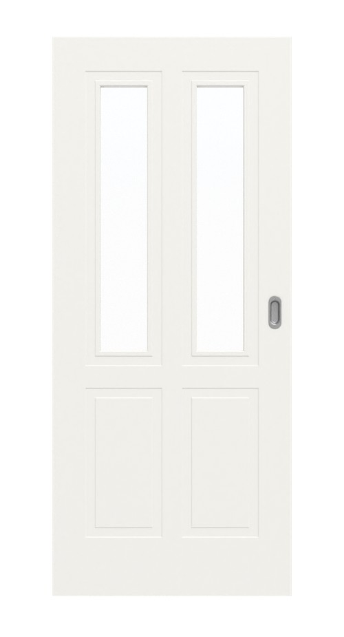 Biała lakierowana powierzchnia w opcjonalnych kolorach RAL 9010 lub 9016 nadaje drzwiom ponadczasową estetykę. Dwa smukłe przeszklenia w górnej części wprowadzają światło do pomieszczenia. Pod nimi delikatne frezowania tworzą stylowe akcenty i nadają klasyczny wygląd kasetowy.