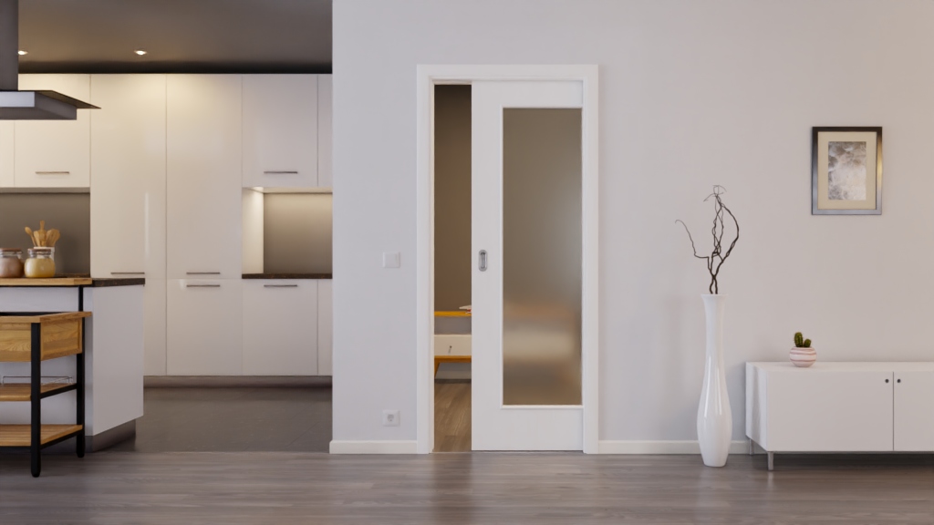 Ponadczasowe drzwi przesuwne z wkładką pełnoformatową i odpornym na zarysowania dekorze Durat: