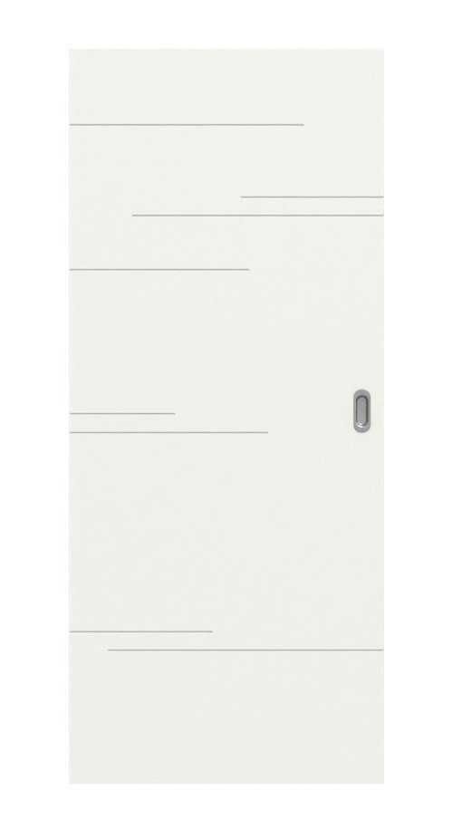 Żywy wzór z krótkimi, poziomymi V-rowkami nadaje nowoczesny wygląd skrzydłu drzwiowemu. Powierzchnia pokryta jest jednolitym lakierem, który w kolorze białym harmonijnie wpasowuje się w przestrzeń.