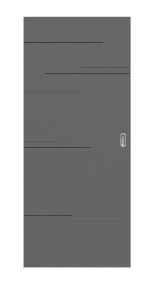 Żywy wzór z krótkimi, poziomymi V-fugami nadaje nowoczesny wygląd skrzydłu drzwiowemu. Ostateczny szlif nadaje projektowi szlachetne lakierowanie w kolorze Hygge szarym.