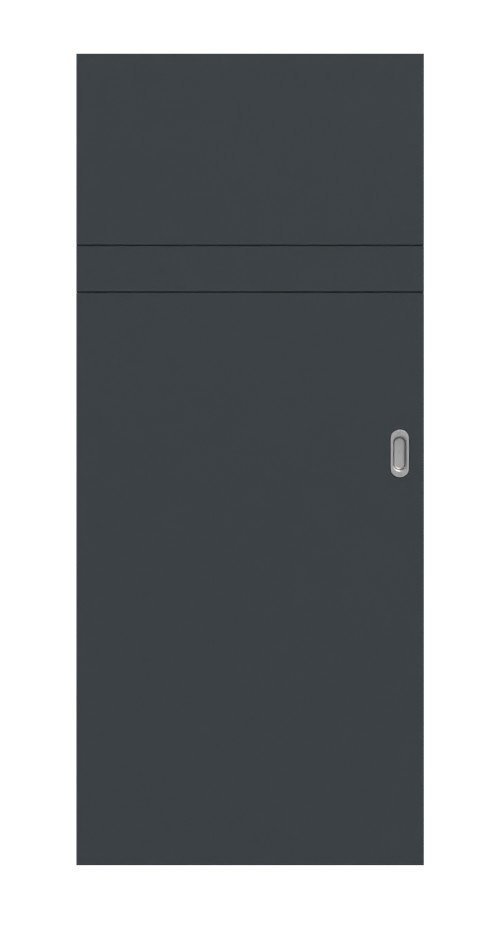Na wysokości oczu w skrzydle drzwi wyfrezowane są dwa równolegle biegnące V-rowki. Ostateczny szlif nadaje projektowi szlachetne lakierowanie w kolorze antracytowym podobnym do RAL 7016.