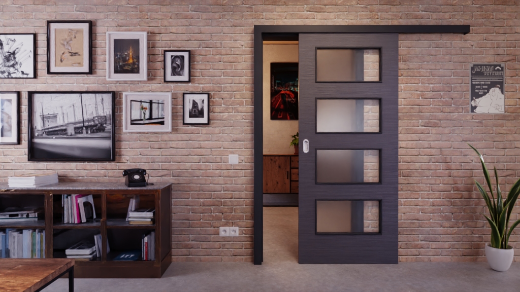Eleganckie drzwi przesuwne w antracycie z przeszklonymi wstawkami i pełnymi wzmocnieniami: