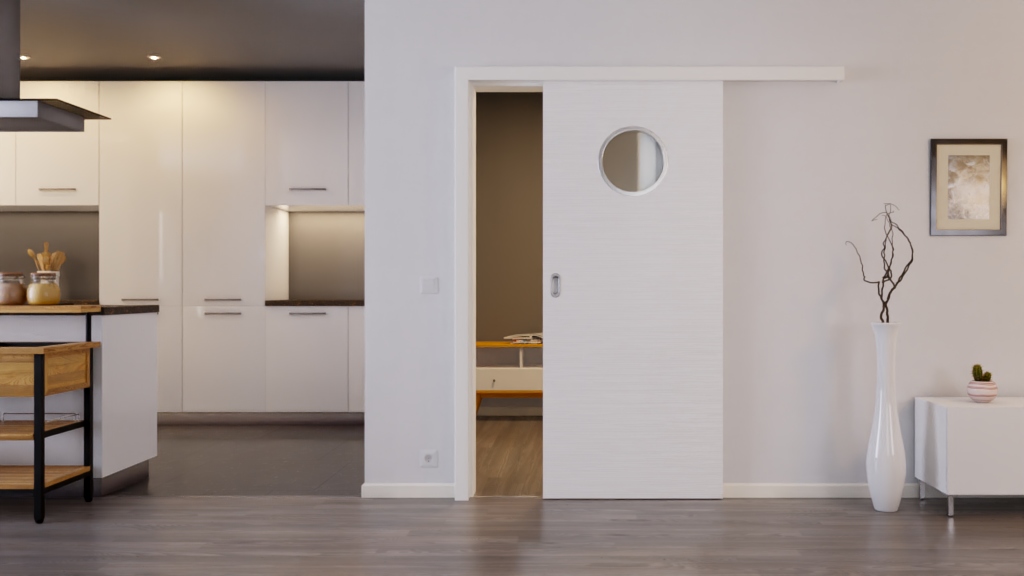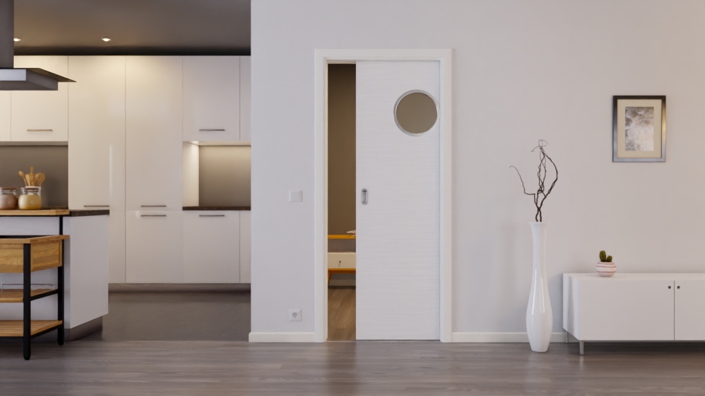 Perfekcyjnie wykonane białe drzwi przesuwne z teksturowaną powierzchnią Durat i bulajem: