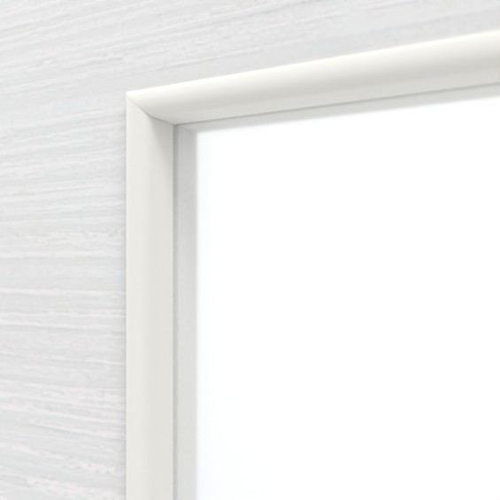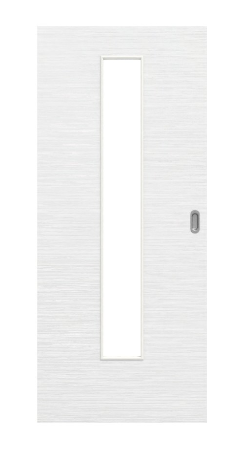 Ładna biała drzwi przesuwne z teksturowaną powierzchnią Durat i wąskim przeszkleniem: