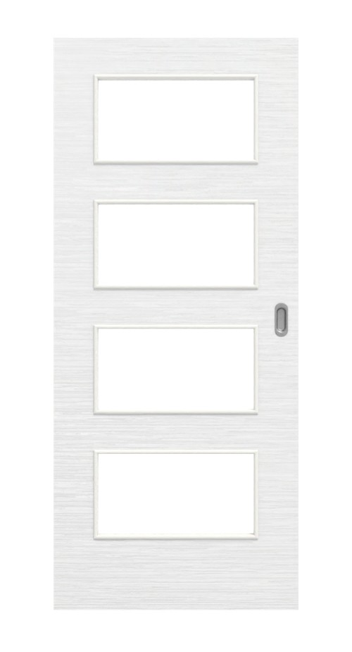Estetyczne białe drzwi przesuwne z teksturowaną powierzchnią Durat i szklanymi wstawkami:
