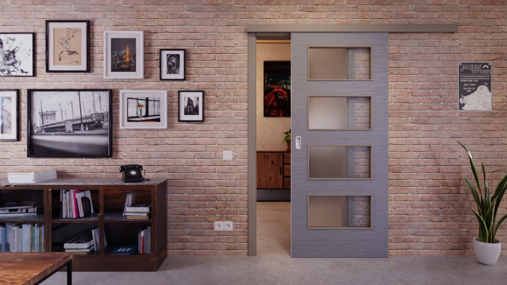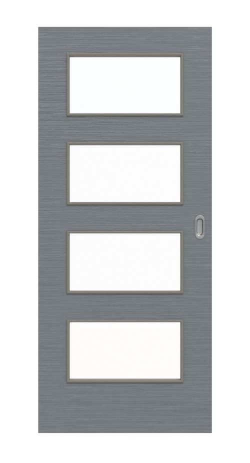 Nowoczesne drzwi przesuwne z teksturowanym dekorem Versio-Durat w kolorze szarym i czterema szklanymi wstawkami: