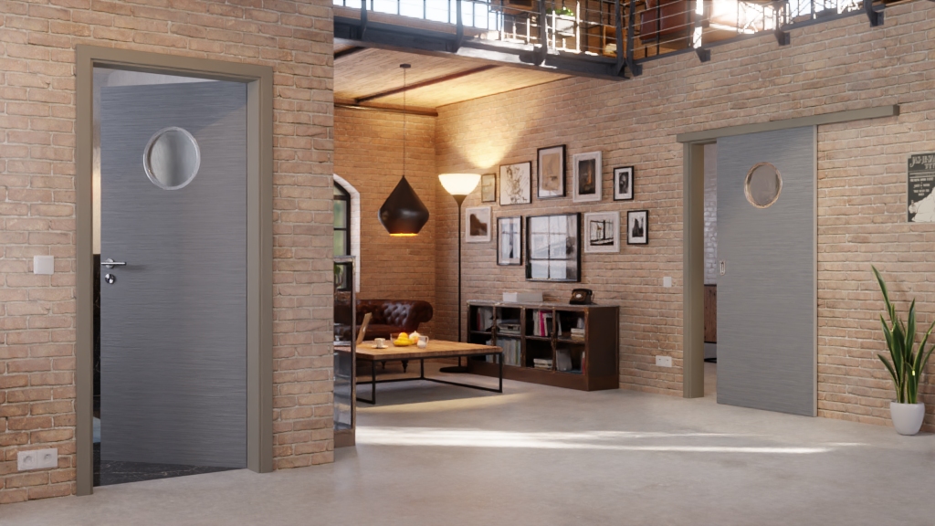 Stylowa drzwi przesuwne z łatwą w pielęgnacji strukturą Versio-Durat i okrągłym przeszkleniem:
