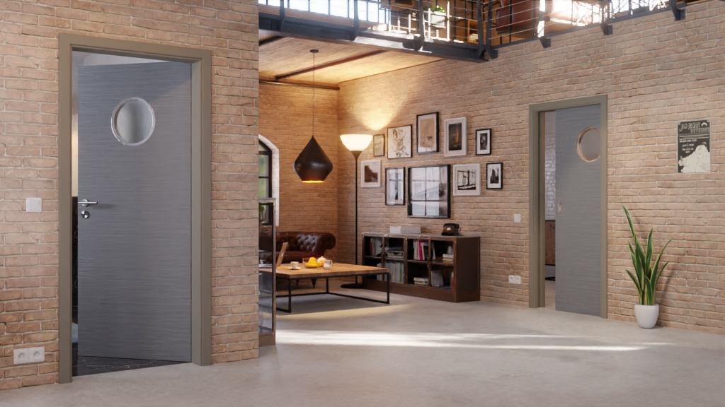 W górnej części skrzydła drzwi znajduje się okrągłe okno świetlne, które przypomina bulaj statku i jest otoczone stalowymi listwami szklanymi. Dzięki delikatnemu odcieniowi Hygge szaro i subtelnej, głęboko wytłaczanej strukturze, powierzchnia Versio-Durat zachwyca zarówno wizualnie, jak i dotykowo. Jednocześnie łatwa w pielęgnacji powłoka fascynuje wysoką odpornością na zużycie.