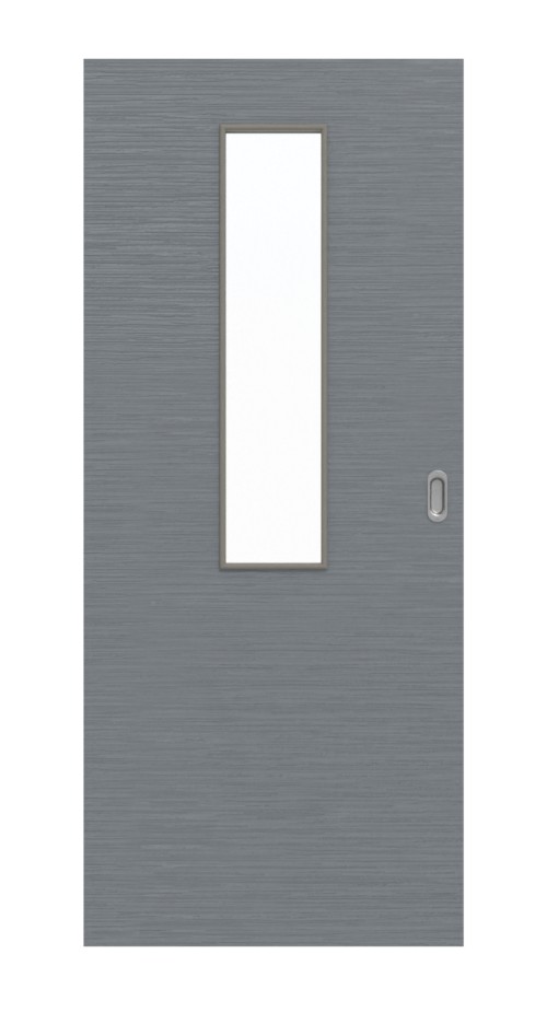 Szara drzwi przesuwne z teksturowanym dekorem Versio-Durat i małym przeszkleniem: