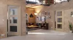Wysokiej jakości drzwi przesuwne w odcieniu taupe z teksturowaną powierzchnią: