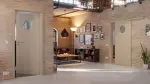 Urokliwa drzwi przesuwne w kolorze taupe z teksturowaną powierzchnią i bulajem: