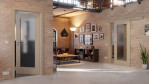 Dzięki dużemu przeszkleniu nie musisz godzić się na ciemne pomieszczenia, ponieważ dodatkowe światło wpada do wnętrza przez szklaną powierzchnię otoczoną nałożonymi listwami. Powierzchnia Versio-Durat zachwyca subtelną strukturą, która jest odczuwalna zarówno wizualnie, jak i dotykowo. Jej spokojny odcień taupe nadaje pomieszczeniu harmonijną atmosferę. Dodatkowo, warstwa wierzchnia jest niezwykle łatwa w pielęgnacji i odporna na ścieranie oraz uderzenia.
