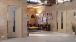 Atrakcyjne drzwi przesuwne w kolorze taupe z teksturowaną powierzchnią i szklanym wcięciem: