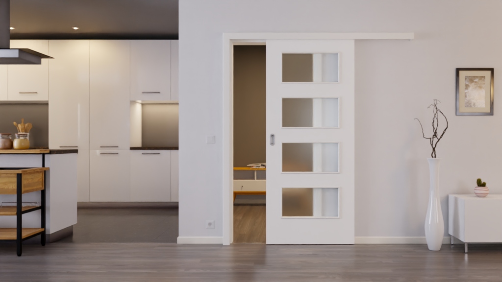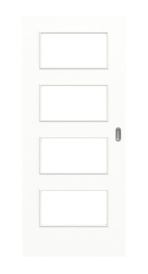 Stylowe drzwi przesuwne z przeszkleniem i dekoracją Durat-Versio w ultramatowej bieli: