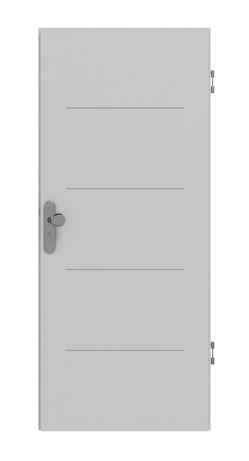 • Drzwi wejściowe do mieszkania z czterema poziomymi frezowanymi rowkami typu V