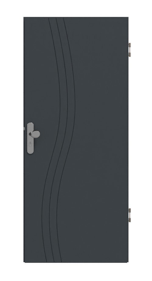 Na długości skrzydła drzwi znajdują się trzy delikatne frezowania w kształcie fal. Dodatkowo projekt imponuje wysokiej jakości wykończeniem lakierem w kolorze antracytowym.