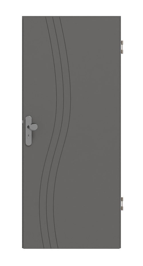 Wzdłuż długości skrzydła drzwi przebiegają trzy delikatne V-frezowania w kształcie fal. Nowoczesny design uzupełnia lakier w spokojnym odcieniu Hygge Szary.