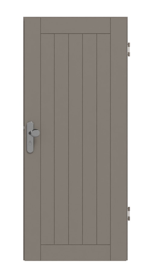 W skrzydle drzwi wfrezowane V-fugi tworzą wzór geometrycznej prostoty. Szlachetny lak w kolorze taupe podkreśla elegancki wygląd.