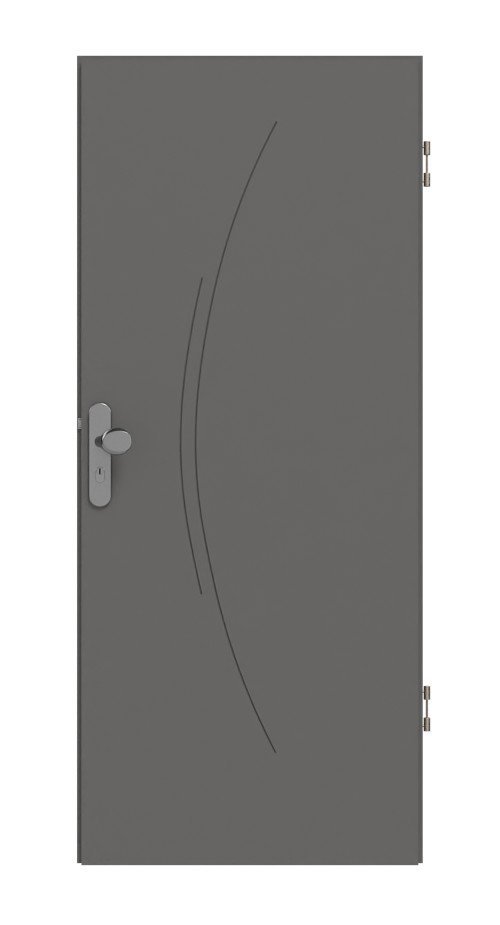 W skrzydle drzwi wyfrezowane są dwa różnej długości, kręte V-fugi, które ściśle do siebie przylegają. Dodatkowo projekt imponuje wysokiej jakości wykończeniem lakierowym w kolorze Hygge Szarym.