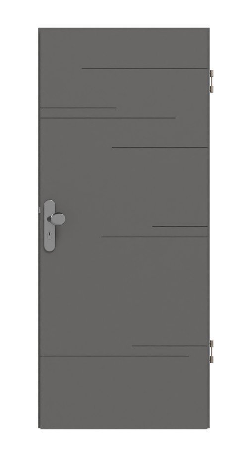 Dynamiczny wzór z krótkimi, poziomymi frezowaniami nadaje nowoczesny wygląd skrzydłu drzwiowemu. Starannie nałożona lakier w odcieniu Hygge Szary doskonale podkreśla delikatny design.