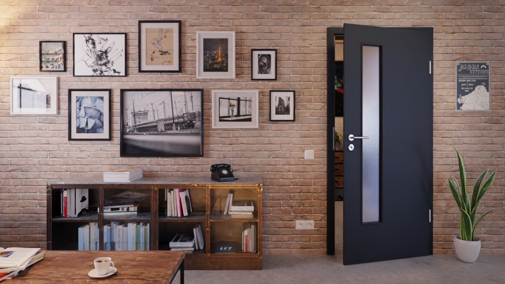 Obok klamki drzwiowej znajduje się wąski szklany wstawka na całej powierzchni skrzydła. Równomiernie nałożona, lakier w antracycie tworzy elegancką i jednolitą powierzchnię.