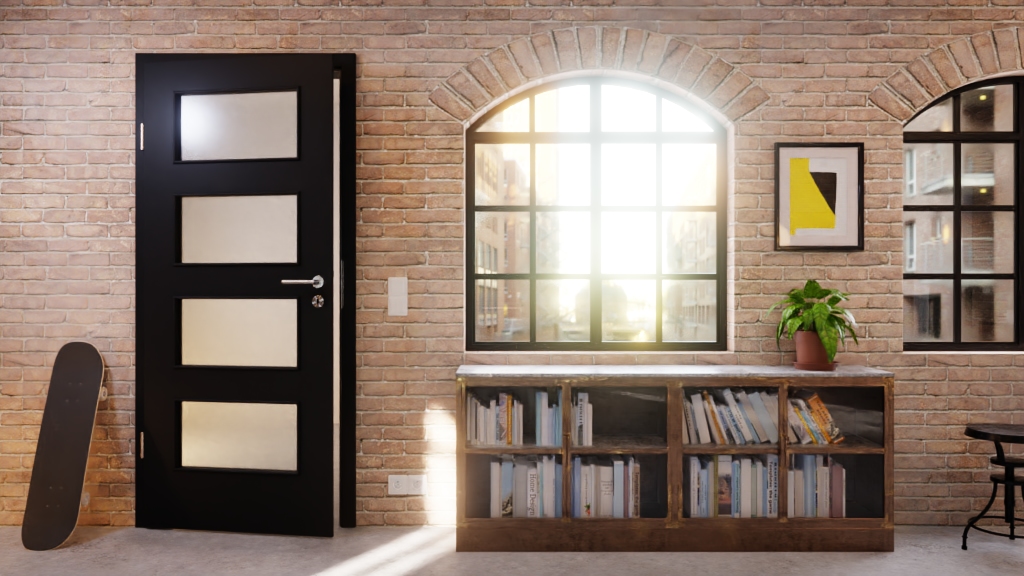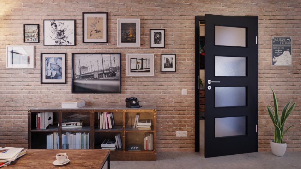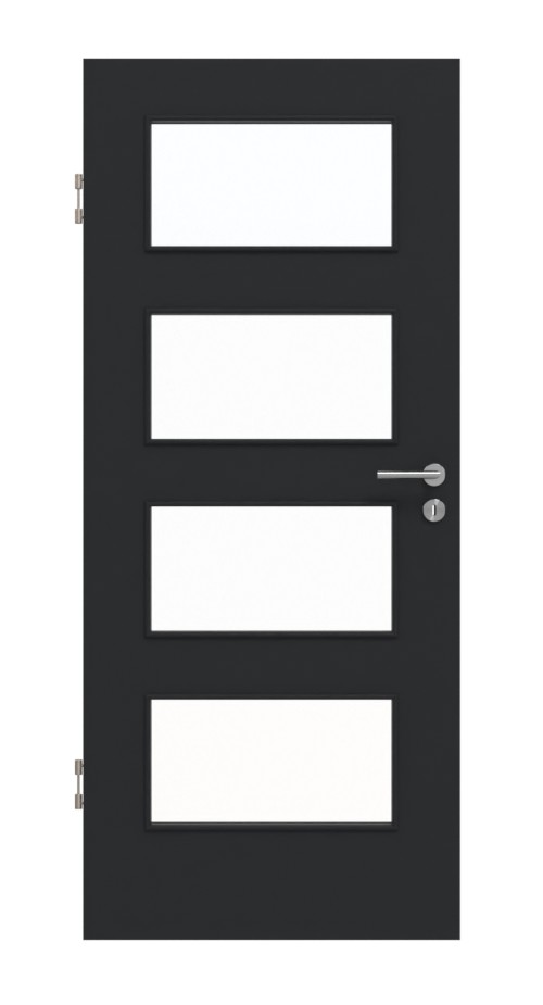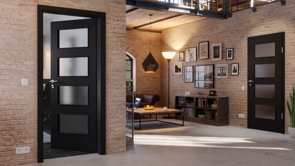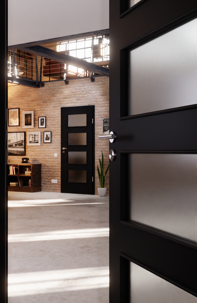 Solidne drzwi wewnętrzne mają wykończenie z matowego lakieru i rdzeń z pełnego wióru: