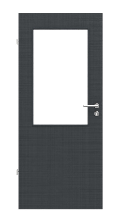 W górnej części skrzydła drzwi znajduje się prostokątny otwór szklany, który zapewnia piękne doświetlenie. Nowoczesny design dopełnia atrakcyjna powierzchnia Durat w wykończeniu Versio Cotton like, która dzięki delikatnej strukturze tworzy subtelny efekt tekstylny. Spokojny kolor Anthrazit można łączyć z wieloma stylami wnętrz. Dodatkowo powierzchnia jest odporna na ścieranie i uderzenia oraz łatwa w pielęgnacji.