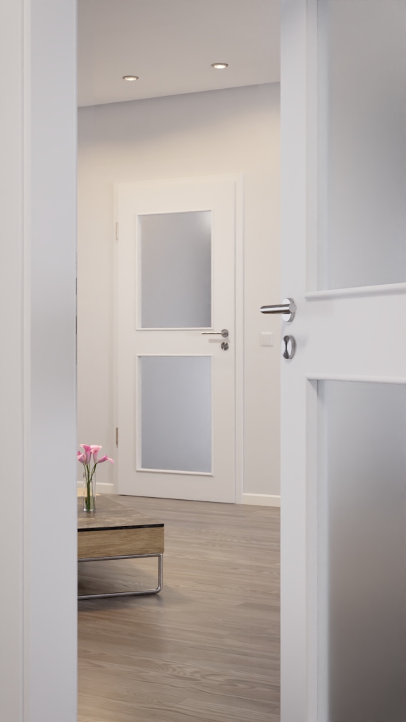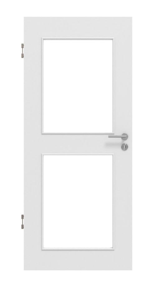Drzwi wyglądają jasno i przyjaźnie, głównie dzięki dwóm dużym przeszkleniom, które są otoczone delikatnymi ramkami szklanymi. Dekor Bütte biały zachwyca jednolitą kolorystyką. Dzięki swojej wytrzymałej strukturze, powierzchnia Durat jest odporna na ścieranie i zarysowania, obiecuje długą żywotność i łatwo się ją czyści.
