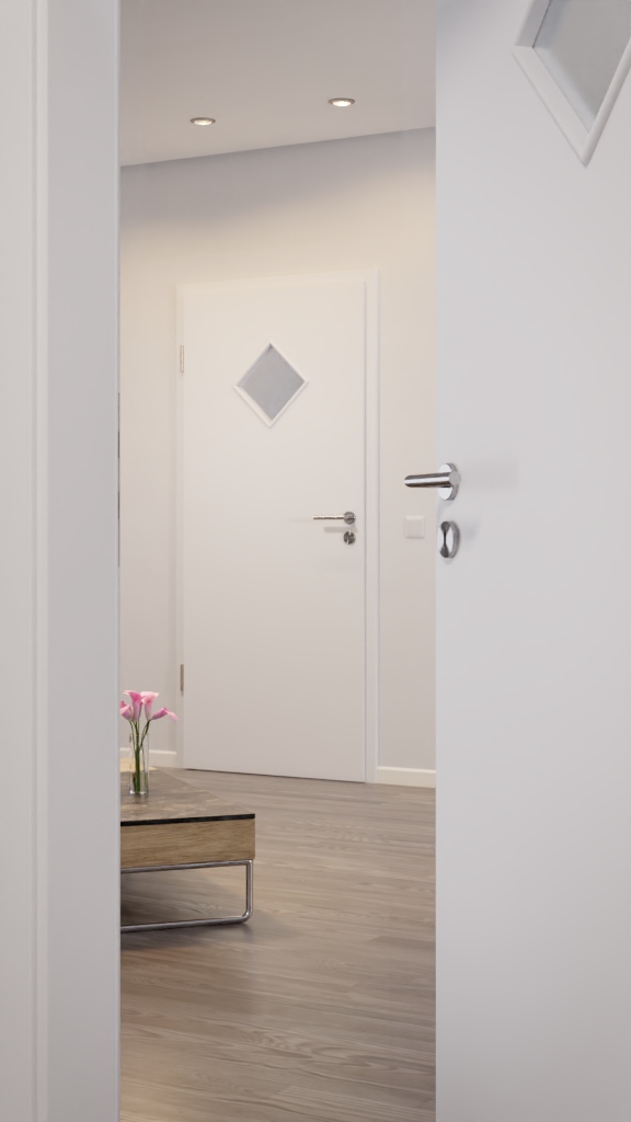 Wyjątkowym punktem centralnym jest rombowy przeszklenie w górnej części skrzydła drzwi. Dzięki stonowanej kolorystyce w odcieniu Bütte białe, model ten można łączyć z każdym stylem wnętrza. Dzięki swojej solidnej konstrukcji, łatwa w pielęgnacji powierzchnia Durat jest odporna na zarysowania i uderzenia.