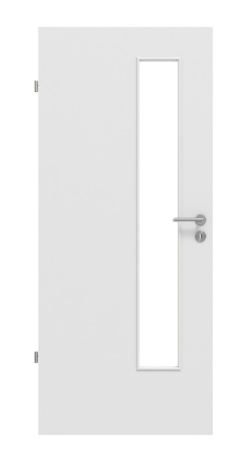 Po stronie zamka skrzydło drzwiowe ozdobione jest pionowym wycięciem ze szkła z nałożonymi listwami szklanymi. Dekor Bütte biały zachwyca swoją jednorodną kolorystyką. Wysoką trwałość obiecuje powierzchnia Durat z żywicy melaminowej dzięki swojej wyjątkowej odporności na zarysowania i uderzenia.